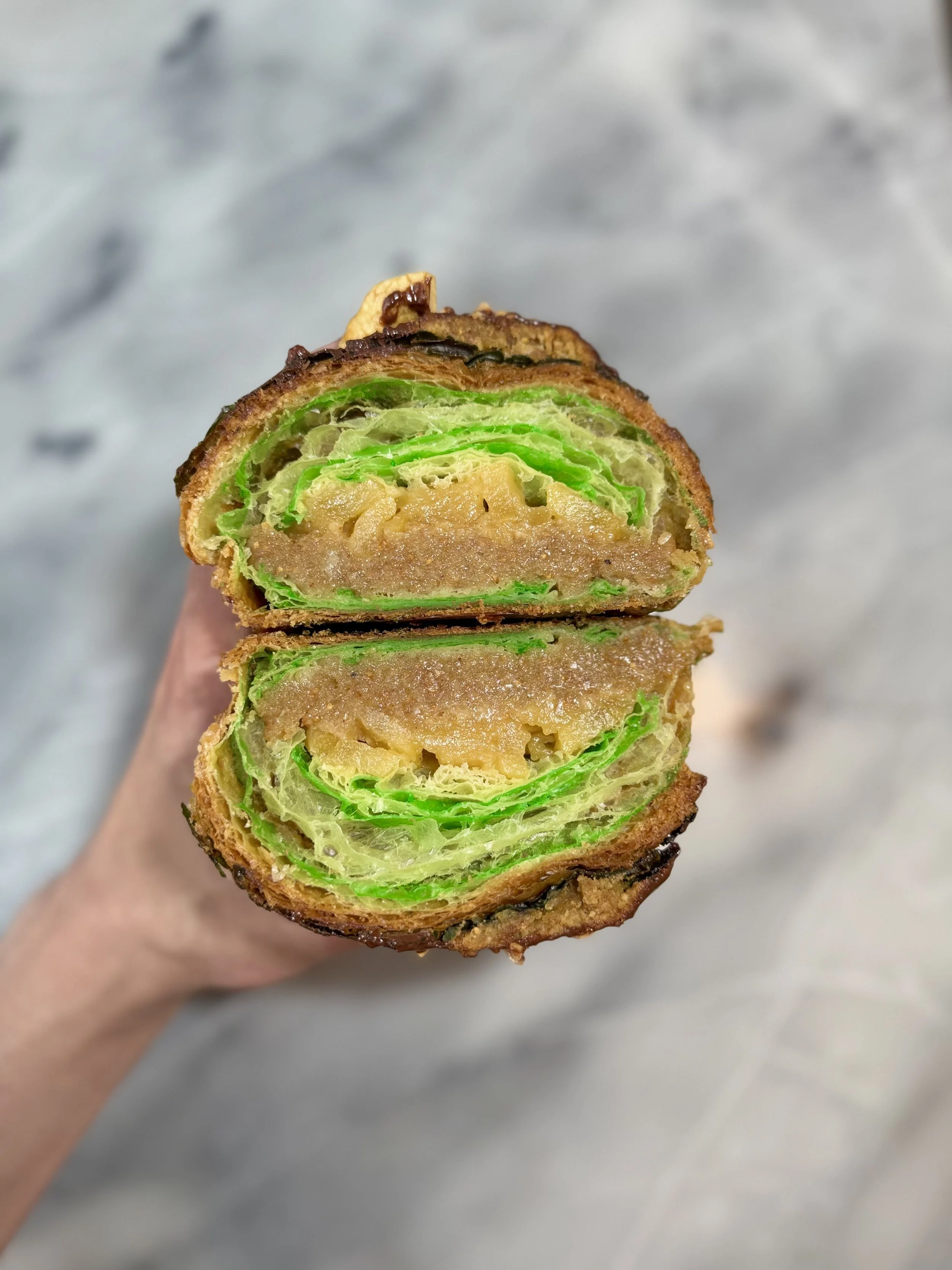 A twice baked bi-colour croissant filled with fig and almond frangipane and candied pear compote, topped with more frangipane and finished with a dark chocolate dip.