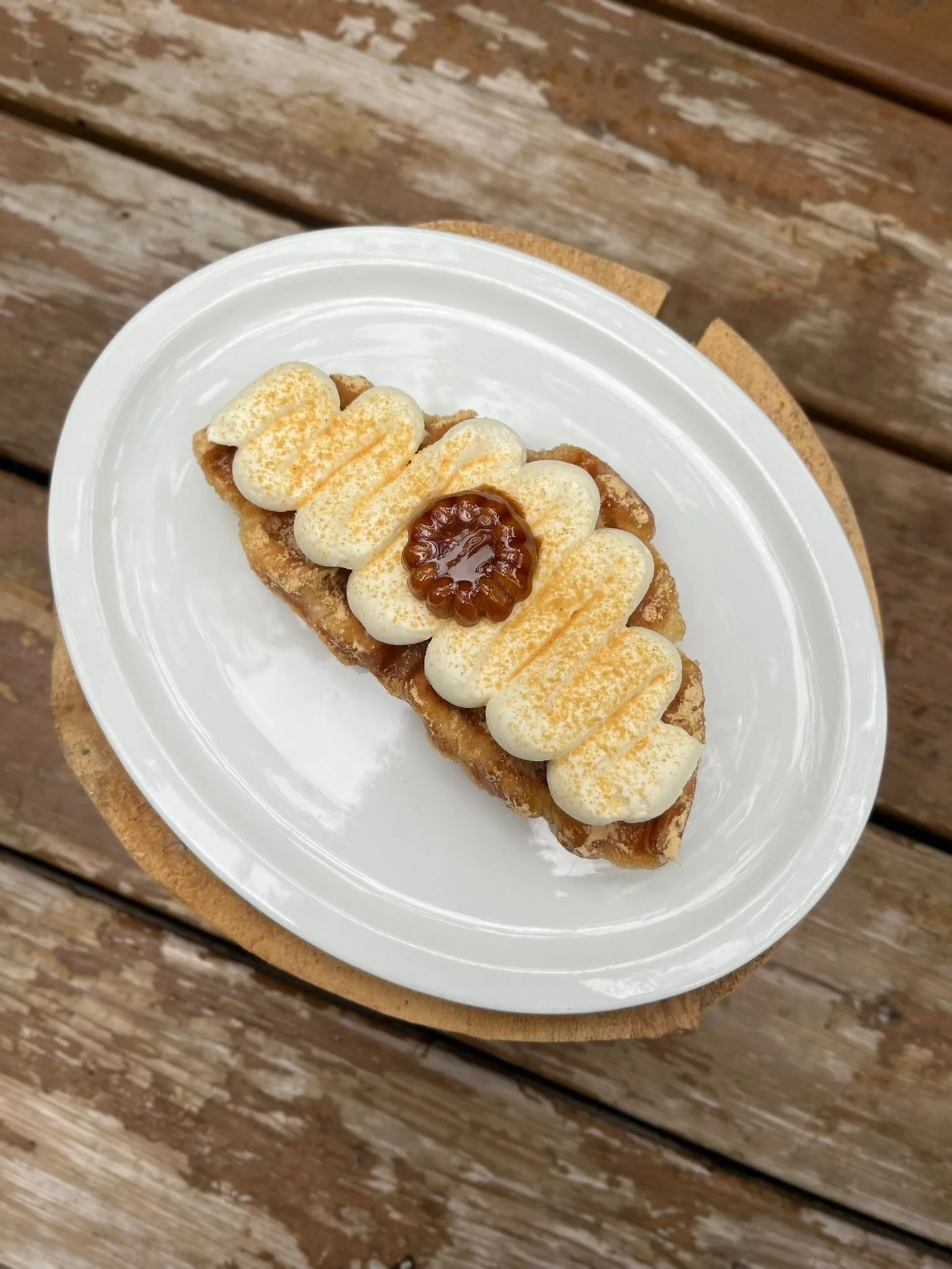 A crispy croffle topped with Injeolmi (roasted soybean) powder, soft cream, and a piece of traditional Korean yakgwa (honey cookie). Itβs a perfect balance of nutty and sweetβ a comforting twist on Korean tradition.