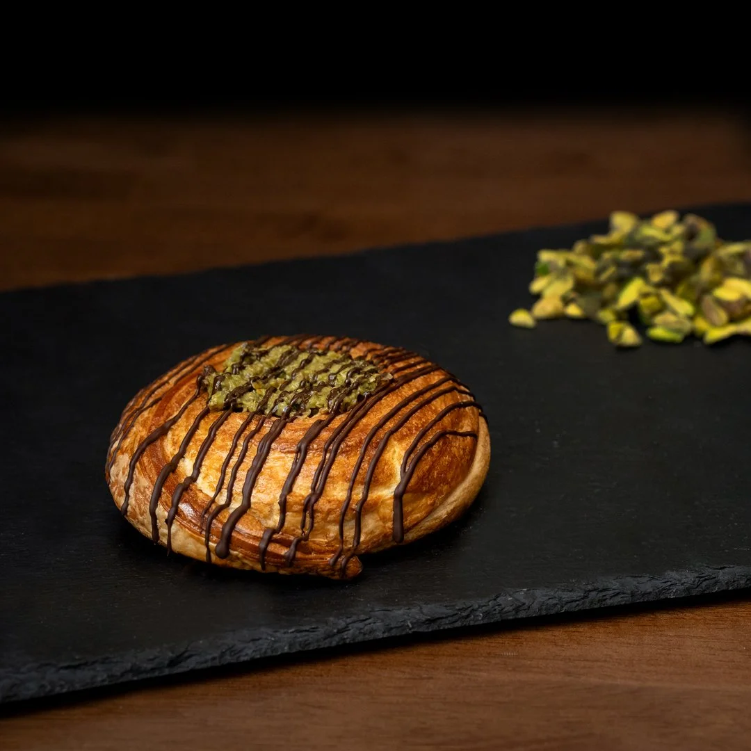 Swirl pain suisse Croissant dough filled with pistachio cream, and dark chocolate drizzle