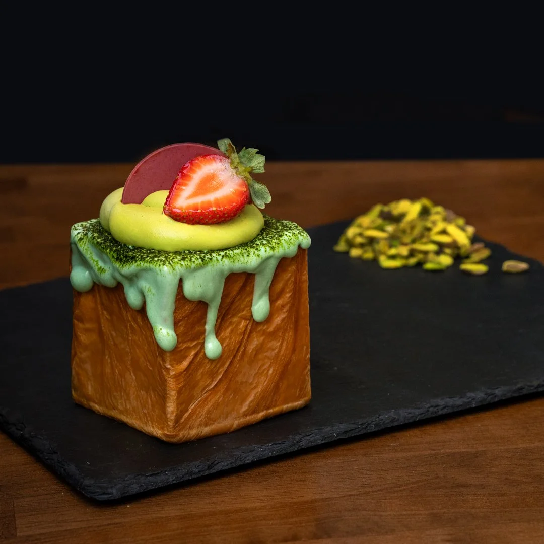 Cube croissant filled with hidden strawberry compote and topped with matcha cloud cream and powder.